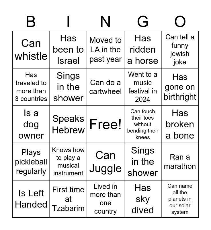 This bingo card has a free space and 24 words: Is Left Handed, Knows how to play a musical instrument, Can do a cartwheel, Has sky dived, Can tell a funny jewish joke, Can whistle, Has been to Israel, Moved to LA in the past year, Can touch their toes without bending their knees, Has broken a bone, Is a dog owner, Sings in the shower, Sings in the shower, Ran a marathon, Has traveled to more than 3 countries, First time at Tzabarim, Lived in more than one country, Has ridden a horse, Has gone on birthright, Plays pickleball regularly, Speaks Hebrew, Can Juggle, Went to a music festival in 2024 and Can name all the planets in our solar system.