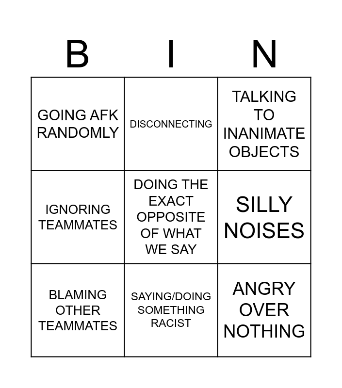 This bingo card has a free space and 8 words: SILLY NOISES, TALKING TO INANIMATE OBJECTS, DISCONNECTING, BLAMING OTHER TEAMMATES, GOING AFK RANDOMLY, ANGRY OVER NOTHING, IGNORING TEAMMATES and SAYING/DOING SOMETHING RACIST.