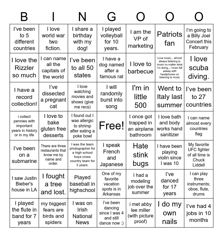 This bingo card has a free space and 48 words: I had a modeling job over the summer, Love music,,, almost always listening to music no matter what I’m doing,,, I even fall asleep with headphones on listening to music, l’ve been dancing since I was 4 and still dance now :), I love to bake gluten free desserts, I love watching movies and shows (give me recs), I can name almost every countries flag, I love world war two fiction., my biggest fears are birds and spiders, Patriots fan, I speak French and Japanese, I’m going to a Billy Joel Concert this February, I played volleyball for 10 years., Went to Italy last summer, I'm in little 500, I saw Justin Bieber's house in LA, I love bath and body works hand sanitizer, I love the Rizzler so much, I love scuba diving., I’ve danced for 17 years, I am the VP of marketing, I love to barbecue, I found out I was allergic to shrimp after eating a poke bowl, I’ve been to 5 different countries, I can name all the capitals of the world, I can play three instruments; oboe, flute, drums, I’ve been to all 50 states, I’ve been to 27 countries, I played the flute in band for 7 years, I will randomly burst into song, I’ve dissected a pregnant cat, I do my own nails, I once got trapped in an airplane bathroom, My favorite UFC fighter of all time is Chuck Liddell, I fought a tree and lost., i collect pennies with important years in history or in my life, Hate stink bugs, I have been playing violin since I was 10, I have a record collection!, I was the team photographer for a high school boys cross country team for 3 years., Played baseball in highschool, I’ve been on a submarine, I’ve had 4 jobs in 10 months, I share a birthday with my dog!, I was on Irish National News, I have a dog named after a famous rat, One of my favorite vacation spots is in Arkansas, There are three restaurants that know me by name and order. and i met abby lee miller (with picture proof).