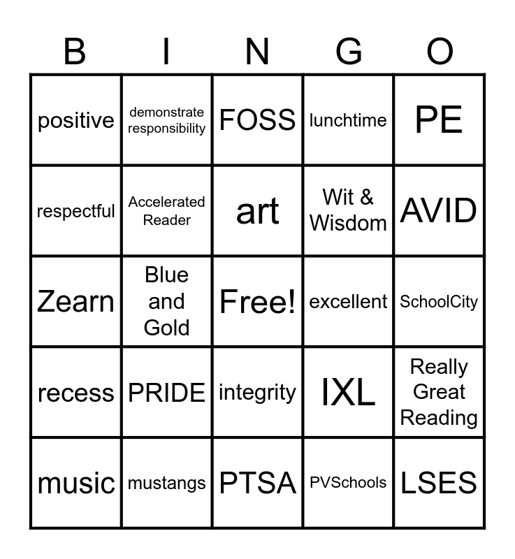 This bingo card has a free space and 24 words: PRIDE, mustangs, art, music, PE, positive, respectful, demonstrate responsibility, excellent, integrity, Wit & Wisdom, Zearn, IXL, Really Great Reading, Accelerated Reader, PVSchools, SchoolCity, FOSS, AVID, Blue and Gold, LSES, recess, lunchtime and PTSA.
