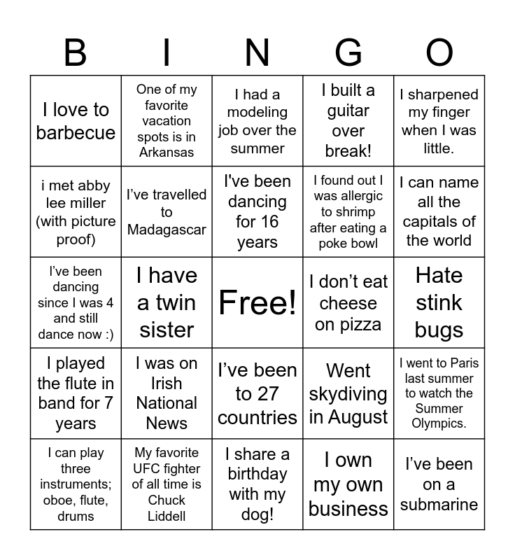 This bingo card has a free space and 48 words: I've been to over 20 countries!, I’ve been on a submarine, I’ve had 4 jobs in 10 months, I share a birthday with my dog!, I was on Irish National News, I have a dog named after a famous rat, One of my favorite vacation spots is in Arkansas, There are three restaurants that know me by name and order., i met abby lee miller (with picture proof), Named after baseball player, I’ve travelled to Madagascar, I built a guitar over break!, I went to Paris last summer to watch the Summer Olympics., Went skydiving in August, I started the Women’s Wrestling club at IU, I lived in turkey for 10 years, I've been dancing for 16 years, I don’t eat cheese on pizza, I am the fastest active, I sharpened my finger when I was little., I have a twin sister, I own my own business, I love to barbecue, I found out I was allergic to shrimp after eating a poke bowl, I’ve been to 5 different countries, I can name all the capitals of the world, I can play three instruments; oboe, flute, drums, I’ve been to all 50 states, I’ve been to 27 countries, I played the flute in band for 7 years, I will randomly burst into song, I’ve dissected a pregnant cat, I do my own nails, I once got trapped in an airplane bathroom, My favorite UFC fighter of all time is Chuck Liddell, I fought a tree and lost., i collect pennies with important years in history or in my life, Hate stink bugs, I have been playing violin since I was 10, I have a record collection!, I was the team photographer for a high school boys cross country team for 3 years., Played baseball in highschool, I had a modeling job over the summer, Love music,,, almost always listening to music no matter what I’m doing,,, I even fall asleep with headphones on listening to music, l’ve been dancing since I was 4 and still dance now :), I love to bake gluten free desserts, I love watching movies and shows (give me recs) and I can name almost every countries flag.