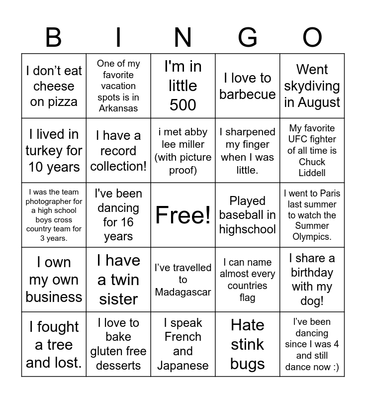 This bingo card has a free space and 63 words: I've been to over 20 countries!, I’ve been on a submarine, I’ve had 4 jobs in 10 months, I share a birthday with my dog!, I was on Irish National News, I have a dog named after a famous rat, One of my favorite vacation spots is in Arkansas, There are three restaurants that know me by name and order., i met abby lee miller (with picture proof), Named after baseball player, I’ve travelled to Madagascar, I built a guitar over break!, I went to Paris last summer to watch the Summer Olympics., Went skydiving in August, I started the Women’s Wrestling club at IU, I lived in turkey for 10 years, I've been dancing for 16 years, I don’t eat cheese on pizza, I am the fastest active, I sharpened my finger when I was little., I have a twin sister, I own my own business, I love to barbecue, I found out I was allergic to shrimp after eating a poke bowl, I’ve been to 5 different countries, I can name all the capitals of the world, I can play three instruments; oboe, flute, drums, I’ve been to all 50 states, I’ve been to 27 countries, I played the flute in band for 7 years, I will randomly burst into song, I’ve dissected a pregnant cat, I do my own nails, I once got trapped in an airplane bathroom, My favorite UFC fighter of all time is Chuck Liddell, I fought a tree and lost., i collect pennies with important years in history or in my life, Hate stink bugs, I have been playing violin since I was 10, I have a record collection!, I was the team photographer for a high school boys cross country team for 3 years., Played baseball in highschool, I had a modeling job over the summer, Love music,,, almost always listening to music no matter what I’m doing,,, I even fall asleep with headphones on listening to music, l’ve been dancing since I was 4 and still dance now :), I love to bake gluten free desserts, I love watching movies and shows (give me recs), I can name almost every countries flag, I love world war two fiction., my biggest fears are birds and spiders, Patriots fan, I speak French and Japanese, I’m going to a Billy Joel Concert this February, I played volleyball for 10 years., Went to Italy last summer, I'm in little 500, I saw Justin Bieber's house in LA, I love bath and body works hand sanitizer, I love the Rizzler so much, I love scuba diving., I’ve danced for 17 years, I am the VP of marketing and I love my megaphone.