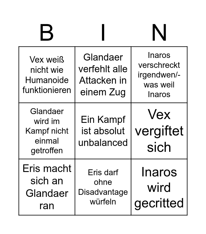 This bingo card has a free space and 8 words: Vex vergiftet sich, Inaros verschreckt irgendwen/-was weil Inaros, Glandaer verfehlt alle Attacken in einem Zug, Eris macht sich an Glandaer ran, Vex weiß nicht wie Humanoide funktionieren, Inaros wird gecritted, Glandaer wird im Kampf nicht einmal getroffen and Eris darf ohne Disadvantage würfeln.