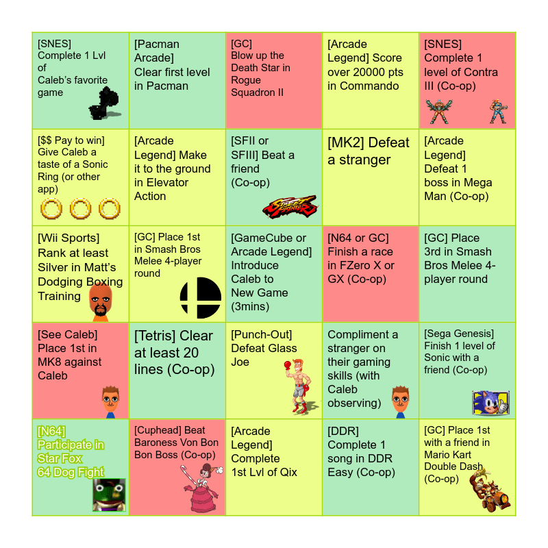 This bingo card has 24 images, a free space and 24 words: [N64] Participate in Star Fox 64 Dog Fight, [Tetris] Clear at least 20 lines (Co-op), [SFII or SFIII] Beat a friend (Co-op), [DDR] Complete 1 song in DDR Easy (Co-op), [SNES] Complete 1 level of Contra III (Co-op), [SNES] Complete 1 Lvl of Caleb’s favorite game, [Pacman Arcade] Clear first level in Pacman, [GC] Blow up the Death Star in Rogue Squadron II, [N64 or GC] Finish a race in FZero X or GX (Co-op), [GC] Place 3rd in Smash Bros Melee 4-player round, [Wii Sports] Rank at least Silver in Matt’s Dodging Boxing Training, [Arcade Legend] Make it to the ground in Elevator Action, Compliment a stranger on their gaming skills (with Caleb observing), [Sega Genesis] Finish 1 level of Sonic with a friend (Co-op), [$$ Pay to win] Give Caleb a taste of a Sonic Ring (or other app), [Cuphead] Beat Baroness Von Bon Bon Boss (Co-op), [Arcade Legend] Complete 1st Lvl of Qix, [Arcade Legend] Score over 20000 pts in Commando, [Arcade Legend] Defeat 1 boss in Mega Man (Co-op), [See Caleb] Place 1st in MK8 against Caleb, [GC] Place 1st in Smash Bros Melee 4-player round, [Punch-Out] Defeat Glass Joe, [MK2] Defeat a stranger and [GC] Place 1st with a friend in Mario Kart Double Dash (Co-op).