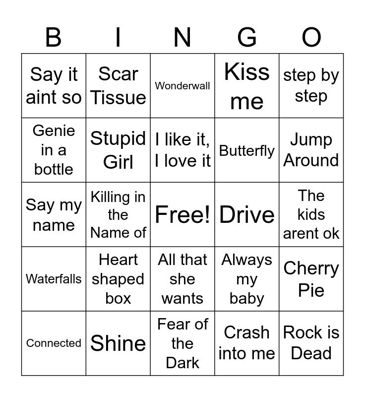 This bingo card has a free space and 29 words: Connected, The Chemicals Between Us, Killing in the Name of, Until it Sleeps, Say it aint so, Wonderwall, Stupid Girl, Heart shaped box, Drive, Shine, The kids arent ok, Rock is Dead, Fear of the Dark, Crash into me, Jump Around, loser, All that she wants, Waterfalls, step by step, Say my name, Always my baby, Be my Lover, Butterfly, Genie in a bottle, Kiss me, Scar Tissue, Cherry Pie, I like it, I love it and MMMBop.