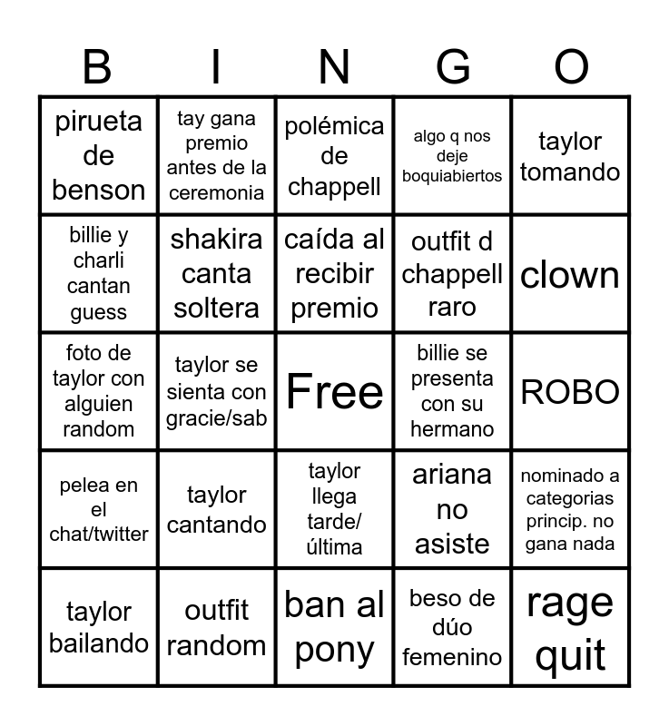 This bingo card has a free space and 24 words: taylor cantando, outfit random, caída al recibir premio, taylor bailando, taylor tomando, pirueta de benson, billie y charli cantan guess, tay gana premio antes de la ceremonia, billie se presenta con su hermano, taylor llega tarde/última, outfit d chappell raro, foto de taylor con alguien random, ariana no asiste, nominado a categorias princip. no gana nada, shakira canta soltera, beso de dúo femenino, ROBO, polémica de chappell, clown, taylor se sienta con gracie/sab, rage quit, pelea en el chat/twitter, algo q nos deje boquiabiertos and ban al pony.