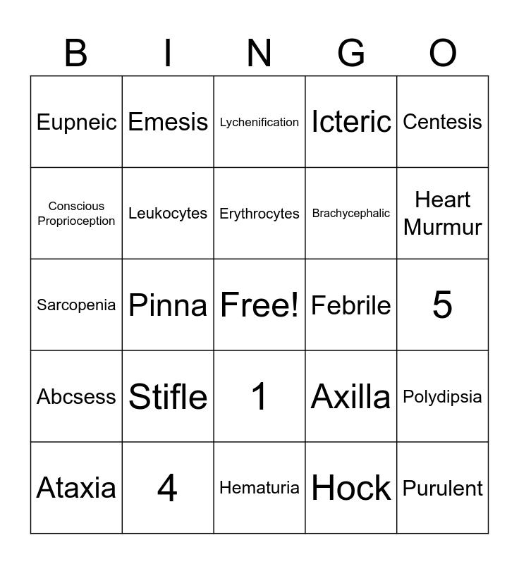 This bingo card has a free space and 24 words: Stifle, 4, Erythrocytes, Ataxia, Centesis, Eupneic, Conscious Proprioception, Emesis, Febrile, 1, Brachycephalic, Sarcopenia, Axilla, Polydipsia, Leukocytes, Hock, 5, Lychenification, Heart Murmur, Pinna, Purulent, Abcsess, Icteric and Hematuria.