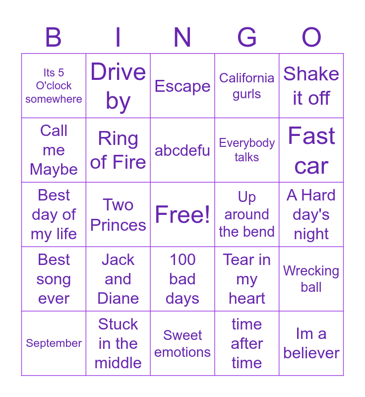 This bingo card has a free space and 29 words: September, Aint no Mountain, Two Princes, Any way you want it, Its 5 O'clock somewhere, Escape, Ring of Fire, Jack and Diane, Up around the bend, Stuck in the middle, A Hard day's night, Im a believer, Sweet emotions, time after time, Fast car, Pumped up kicks, 100 bad days, Best song ever, Shake it off, Best day of my life, Tear in my heart, Believer, Everybody talks, Call me Maybe, California gurls, Drive by, Wrecking ball, abcdefu and Happy.