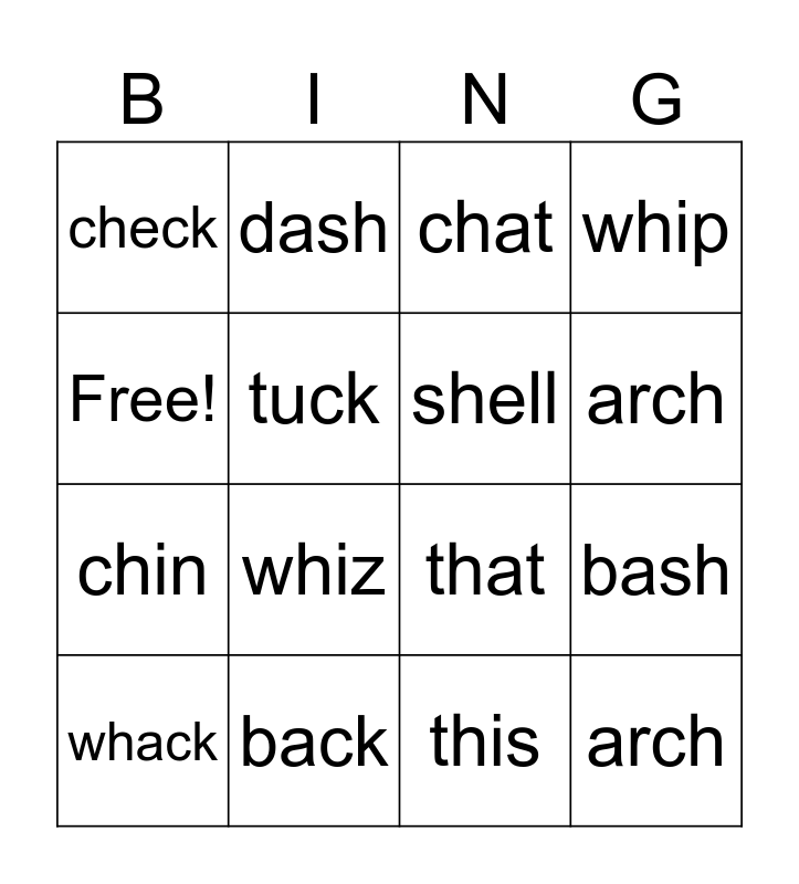 This bingo card has 16 words: back, bash, chat, check, chin, dash, that, this, Free!, tuck, whack, whip, whiz, arch, shell and arch.