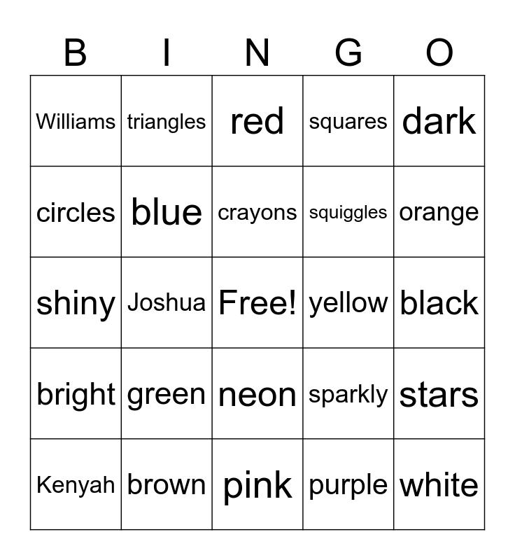This bingo card has a free space and 29 words: Kenyah, Neo, Joshua, Alanna, Williams, red, blue, green, yellow, brown, black, white, pink, purple, orange, rainbow, neon, bright, dark, shiny, sparkly, glitter, squiggles, circles, squares, triangles, stars, crayons and color.