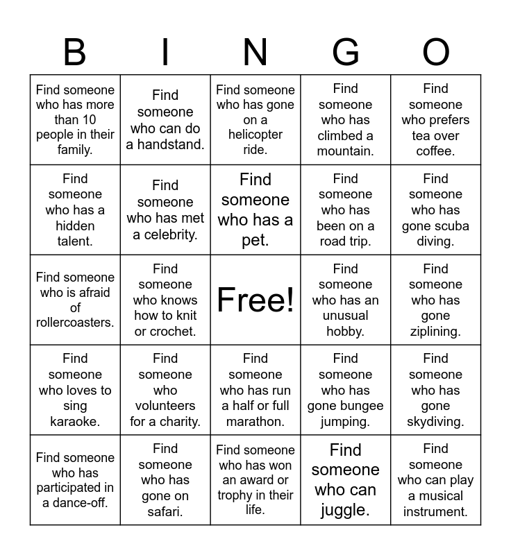 This bingo card has a free space and 46 words: Find someone who has traveled to at least three continents., Find someone who can play a musical instrument., Find someone who speaks more than one language., Find someone who has won an award or trophy in their life., Find someone who volunteers for a charity., Find someone who loves spicy food., Find someone who can do a handstand., Find someone who has read at least 20 books in 2024., Find someone who has a hidden talent., Find someone who has seen their favourite band live., Find someone who has met a celebrity., Find someone who has climbed a mountain., Find someone who has gone skydiving., Find someone who has gone bungee jumping., Find someone who loves to cook or bake., Find someone who can solve a Rubik’s cube., Find someone who has a pet., Find someone who has an unusual hobby., Find someone who does yoga or practices meditation., Find someone who prefers tea over coffee., Find someone who knows how to knit or crochet., Find someone who can juggle., Find someone who has more than 10 people in their family., Find someone who has been on a road trip., Find someone who has attended a music festival., Find someone who has gone scuba diving., Find someone who has participated in a dance-off., Find someone who enjoys hiking or camping., Find someone who has run a half or full marathon., Find someone who loves to sing karaoke., Find someone who can perform a magic trick., Find someone who has moved house in the past year., Find someone who loves country music., Find someone who has twins in their family., Find someone who has traveled outside of the country in the past year., Find someone who has gone on safari., Find someone who has gone ziplining., Find someone who has gone white water rafting., Find someone who has gone surfing., Find someone who has gone on a hot air balloon ride., Find someone who has seen their favourite sports team., Find someone who has gone on a helicopter ride., Find someone who is afraid of rollercoasters., Find someone who has the same birthday month as you., Find someone who has gone on a cruise. and Find someone who has gone to a museum in the last month..