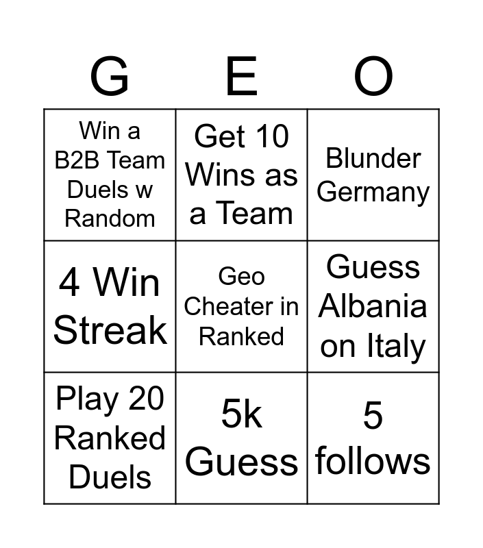 This bingo card has a free space and 8 words: Guess Albania on Italy, Blunder Germany, Get 10 Wins as a Team, Play 20 Ranked Duels, Win a B2B Team Duels w Random, 5 follows, 4 Win Streak and 5k Guess.
