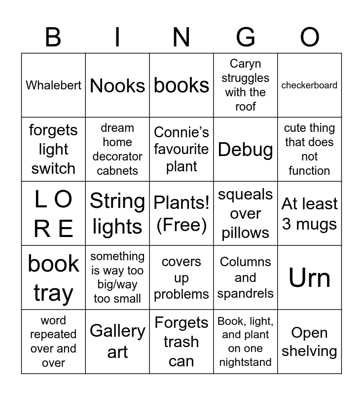 This bingo card has a free space and 24 words: something is way too big/way too small, Gallery art, Connie’s favourite plant, word repeated over and over, checkerboard, Whalebert, forgets light switch, Nooks, squeals over pillows, covers up problems, Debug, L O R E, Columns and spandrels, Urn, dream home decorator cabnets, Book, light, and plant on one nightstand, At least 3 mugs, books, cute thing that does not function, String lights, Open shelving, book tray, Caryn struggles with the roof and Forgets trash can.