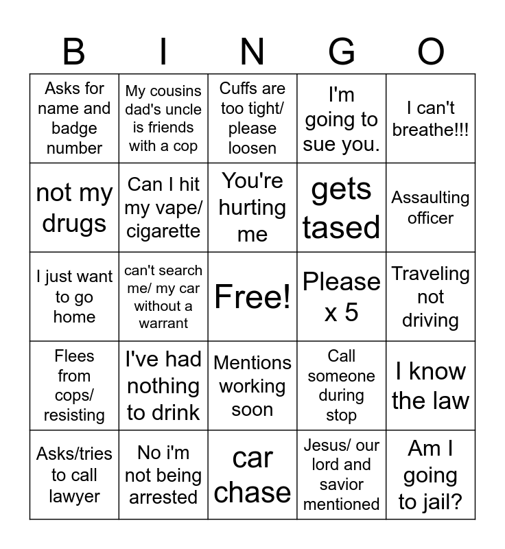 This bingo card has a free space and 34 words: Outstanding warrant, Jesus/ our lord and savior mentioned, Sovereign citizen, Having tantrum in cop car. Screaming/ hitting head, Flees from cops/ resisting, Can I hit my vape/ cigarette, I can't breathe!!!, Asks/tries to call lawyer, My cousins dad's uncle is friends with a cop, I live just down the road/nearby, You're hurting me, Cuffs are too tight/ please loosen, Did I do something wrong?, Begging/ crying after acting tough, Please x 5, Assaulting officer, No i'm not being arrested, I just want to go home, I've had nothing to drink, Call someone during stop, Mentions working soon, I have kids, Asks for name and badge number, Traveling not driving, car chase, Am I going to jail?, I'm going to sue you., Multiple people arrested, gets tased, not my drugs, call my..., can't search me/ my car without a warrant, I know the law and I know the law.