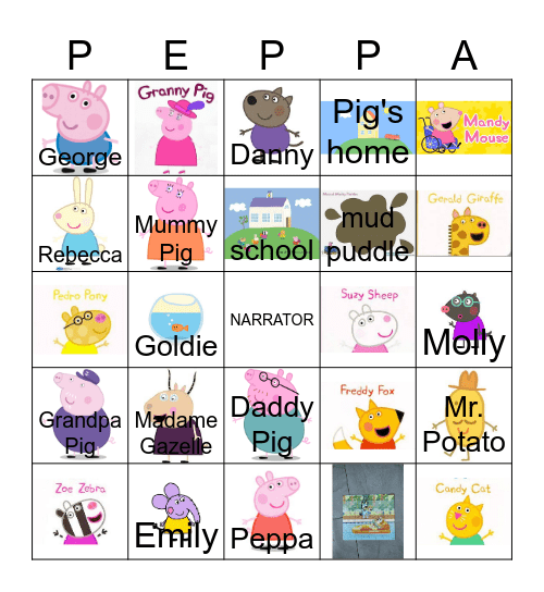 This bingo card has 25 images, a free space and 16 words: Madame Gazelle, Peppa, school, George, Rebecca, Daddy Pig, mud puddle, Mr. Potato, Mummy Pig, Mr. Skinny Legs, Molly, Danny, Goldie, Emily, Grandpa Pig and Pig's home.