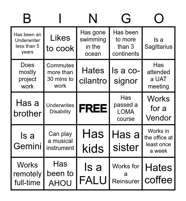 This bingo card has a free space and 44 words: Has a dog, Hates coffee, Underwrites Critical Illness, Works remotely full-time, Can speak another language, Works for a Reinsurer, Has gone swimming in the ocean, Watches or plays hockey, Is a Sagittarius, Has been to AHOU, Has been to more than 3 continents, Has passed a LOMA course, Has kids, Can play a musical instrument, Born in January, Is a FALU, Has broken a bone, Has a brother, Has a cat, Has attended a UAT meeting, Likes to cook, Attended a CIU last year, Has an 'S' in their name, Has been an Underwriter less than 5 years, Works for a Direct Carrier, Works for a Vendor, Is currently enrolled in an ALU course, Has been an Underwriter over 10 years, Has a sister, Is a Gemini, Drinks tea in the morning, Works in the office at least once a week, Watches or plays soccer, Has gone camping, Underwrites Disability, Has worked as a manager before, Has been to a UAT social before, Has lived abroad, Hates cilantro, Does mostly project work, Is a co-signor, Can ski or snowboard, Commutes more than 30 mins to work and Likes to paint or draw.