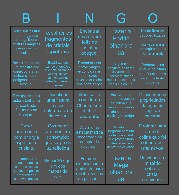 This bingo card has 25 words: Combater um monstro corrompido que surge da luz refletida., Entrar em sintonia com o ambiente para receber visões do passado., Encontrar uma chave mágica escondida nas profundezas da caverna que abre uma porta antiga., Encontrar uma nascente oculta entre as rochas que dizem possuir propriedades curativas únicas., Neutralizar os vapores tóxicos que começaram a emergir de uma fonte termal,, Selar uma fissura de energia que ameaça liberar criaturas mágicas perigosas na colina., Destruir a toca de um monstro que começou a atrair outras criaturas perigosas para o bosque., Recolher os fragmentos de cristais espirituais., Escavar uma parte esquecida da colina que parece esconder ruínas de uma civilização antiga., Ativar uma estátua mágica encontrada na entrada da caverna ., Seguir um conjunto de flores de vidro que parecem brilhar mais intensamente sob a luz da lua,, Recuperar uma esfera brilhante encontrada flutuando no bosque., Derrotar ou negociar com um golem de cristal que protege uma câmara secreta dentro da caverna., Explorar uma área da colina que foi coberta por uma névoa., Estabilizar um campo energético que está causando desequilíbrios elementais nas fontes termais e no bosque., Desvendar o mistério sobre o cristal crescente., Desvendar as propriedades da água do lago da caverna, Encontrar uma árvore feita de cristal no bosque., Restaurar um círculo de runas danificado perto da entrada da caverna., Investigar uma fissura no céu noturno acima da colina., Recusar a comida do Charlie, sem motivo aparente., Riscar/Rasgar um dos mapas do Folk., Fazer ferramentas com energia espiritual e cristais., Fazer a Hadria olhar pra lua. and Fazer a Mega olhar pra lua..