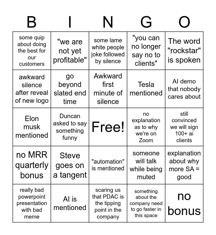 This bingo card has a free space and 24 words: Steve goes on a tangent, AI is mentioned, Awkward first minute of silence, really bad powerpoint presentation with bad meme, The word "rockstar" is spoken, some quip about doing the best for our customers, awkward silence after reveal of new logo, "we are not yet profitable", no explanation as to why we're on Zoom, "automation" is mentioned, Tesla mentioned, Elon musk mentioned, someone will talk while being muted, explanation about why more SA = good, go beyond slated end time, something about the company need to go faster in this space, still convinced we will sign 100+ ai clients, some lame white people joke followed by silence, AI demo that nobody cares about, Duncan asked to say something funny, no bonus, no MRR quarterly bonus, "you can no longer say no to clients" and scaring us that PDAC is the tipping point in the company.