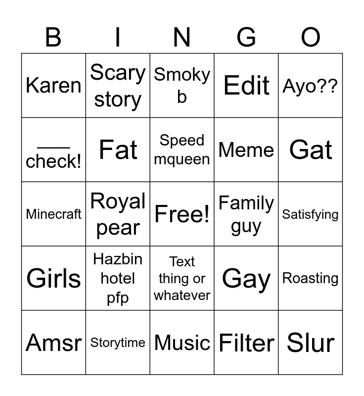 This bingo card has a free space and 24 words: Hazbin hotel pfp, Storytime, Speed mqueen, Amsr, Ayo??, Karen, ___ check!, Scary story, Family guy, Text thing or whatever, Meme, Minecraft, Gay, Roasting, Fat, Filter, Satisfying, Smoky b, Gat, Royal pear, Slur, Girls, Edit and Music.