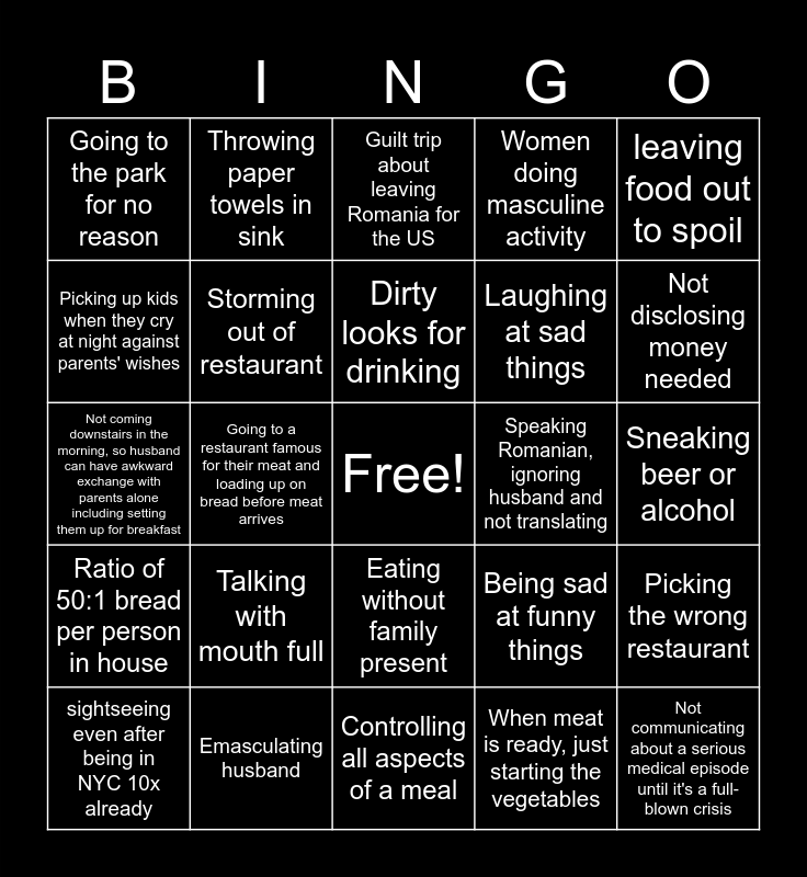 This bingo card has a free space and 24 words: Talking with mouth full, Emasculating husband, Dirty looks for drinking, sightseeing even after being in NYC 10x already, leaving food out to spoil, Going to the park for no reason, Picking up kids when they cry at night against parents' wishes, Throwing paper towels in sink, Speaking Romanian, ignoring husband and not translating, Eating without family present, Laughing at sad things, Not coming downstairs in the morning, so husband can have awkward exchange with parents alone including setting them up for breakfast, Being sad at funny things, Picking the wrong restaurant, Storming out of restaurant, When meat is ready, just starting the vegetables, Sneaking beer or alcohol, Guilt trip about leaving Romania for the US, Not disclosing money needed, Going to a restaurant famous for their meat and loading up on bread before meat arrives, Not communicating about a serious medical episode until it's a full-blown crisis, Ratio of 50:1 bread per person in house, Women doing masculine activity and Controlling all aspects of a meal.