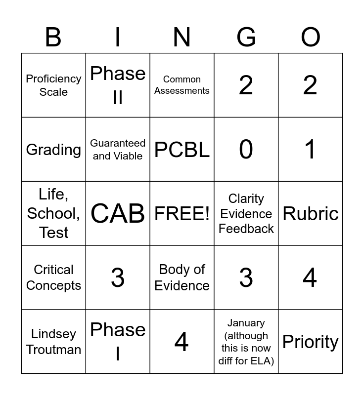 This bingo card has a free space and 24 words: 3, Phase I, PCBL, Lindsey Troutman, 2, Proficiency Scale, Grading, Phase II, Clarity Evidence Feedback, Body of Evidence, 0, Life, School, Test, 3, 4, Guaranteed and Viable, January (although this is now diff for ELA), Rubric, Common Assessments, 1, CAB, Priority, Critical Concepts, 2 and 4.