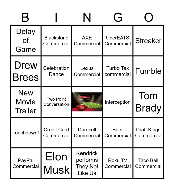 This bingo card has a free space and 37 words: Shoe Commercial, BEYONCE, Injured Player, Celebration Dance, Draft Kings Commercial, Credit Card Commercial, Lexus Commercial, FedEx Commercial, Streaker, Pass Interference, Two Point Conversation, UberEATS Commercial, Taco Bell Commercial, Tom Brady, Drew Brees, Touchdown!, Travel Booking Site Commercial, AXE Commercial, Duracell Commercial, Interception, Delay of Game, Fumble, PayPal Commercial, Kendrick performs They Not Like Us, HULU Commercial, Roku TV Commercial, Blackstone Commercial, Snoop Dogg, SZA, BET MGM Commercial, American Flag, Elon Musk, New Movie Trailer, Taylor Swift, Beer Commercial, Turbo Tax commercial and Robinhood Commercial.