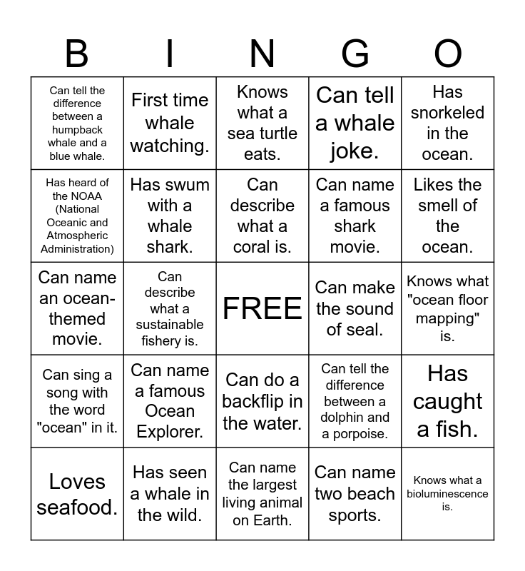 This bingo card has a free space and 24 words: Can name a famous Ocean Explorer., Has seen a whale in the wild., Can describe what a coral is., Loves seafood., Has snorkeled in the ocean., Can tell the difference between a humpback whale and a blue whale., Has heard of the NOAA (National Oceanic and Atmospheric Administration), First time whale watching., Can make the sound of seal., Can do a backflip in the water., Can name a famous shark movie., Can name an ocean-themed movie., Can tell the difference between a dolphin and a porpoise., Has caught a fish., Has swum with a whale shark., Can name two beach sports., Knows what "ocean floor mapping" is., Knows what a sea turtle eats., Likes the smell of the ocean., Can describe what a sustainable fishery is., Knows what a bioluminescence is., Can sing a song with the word "ocean" in it., Can tell a whale joke. and Can name the largest living animal on Earth..