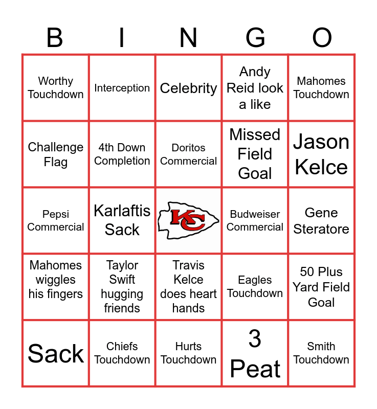 This bingo card has a free space and 34 words: Taylor Swift, 3 Peat, Trick Play, Tush Push, Mahomes wiggles his fingers, 4th Down Completion, Mahomes Touchdown, Sack, Interception, End Zone Dance, Doritos Commercial, Celebrity, Fumble, Donna Kelce, Budweiser Commercial, Jason Kelce, Chiefs Touchdown, Pepsi Commercial, Taylor Swift hugging friends, Eagles Touchdown, Travis Kelce does heart hands, GOAT, Worthy Touchdown, Gene Steratore, Hurts Touchdown, Smith Touchdown, Andy Reid look a like, Successful 2 point Conversion, Missed Field Goal, Challenge Flag, Chris Jones Sack, Karlaftis Sack, 50 Plus Yard Field Goal and Pick 6.