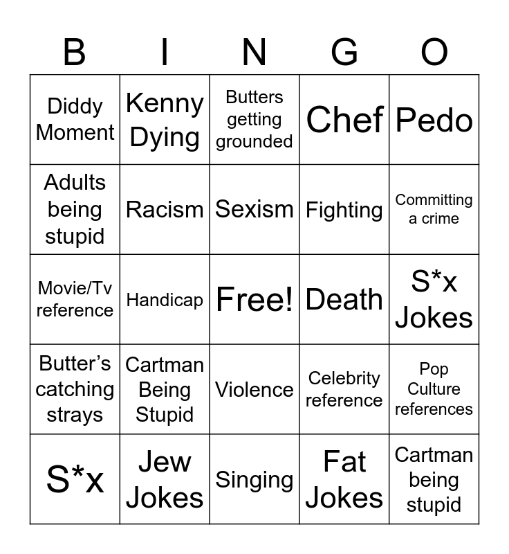 This bingo card has a free space and 24 words: Cartman Being Stupid, Jew Jokes, Sexism, S*x, Pedo, Diddy Moment, Adults being stupid, Kenny Dying, Death, Violence, Fighting, Movie/Tv reference, Celebrity reference, Pop Culture references, Racism, Fat Jokes, S*x Jokes, Butters getting grounded, Committing a crime, Handicap, Cartman being stupid, Butter’s catching strays, Chef and Singing.