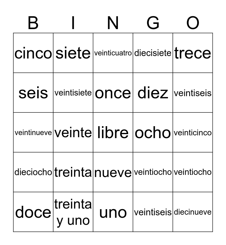This bingo card has a free space and 24 words: treinta, treinta y uno, once, doce, trece, cinco, seis, siete, ocho, nueve, diez, veintinueve, veintiocho, veintiocho, veintisiete, veintiseis, veinticinco, veinticuatro, veintiseis, veinte, diecinueve, dieciocho, diecisiete and uno.