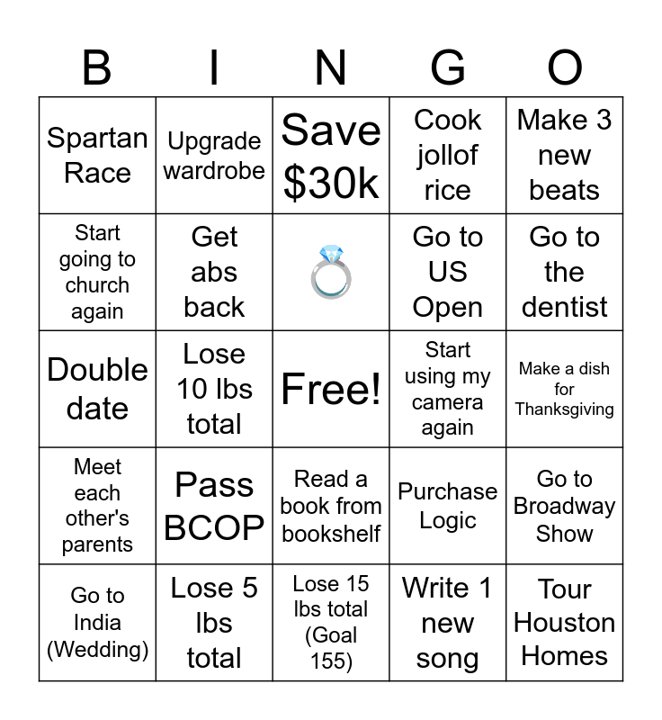 This bingo card has a free space and 24 words: Pass BCOP, Lose 5 lbs total, 💍, Go to India (Wedding), Make 3 new beats, Spartan Race, Start going to church again, Upgrade wardrobe, Start using my camera again, Read a book from bookshelf, Go to US Open, Double date, Purchase Logic, Go to Broadway Show, Get abs back, Write 1 new song, Make a dish for Thanksgiving, Save $30k, Go to the dentist, Lose 10 lbs total, Tour Houston Homes, Meet each other's parents, Cook jollof rice and Lose 15 lbs total (Goal 155).