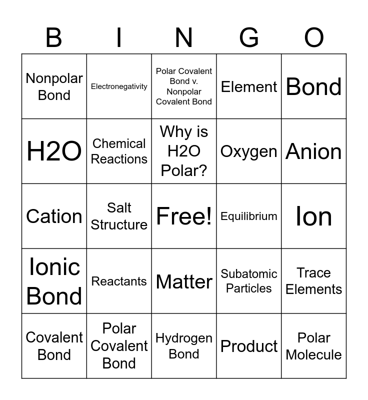 This bingo card has a free space and 24 words: Reactants, Polar Covalent Bond, Why is H2O Polar?, Covalent Bond, Bond, Nonpolar Bond, H2O, Electronegativity, Equilibrium, Matter, Oxygen, Cation, Subatomic Particles, Trace Elements, Chemical Reactions, Product, Ion, Polar Covalent Bond v. Nonpolar Covalent Bond, Anion, Salt Structure, Polar Molecule, Ionic Bond, Element and Hydrogen Bond.