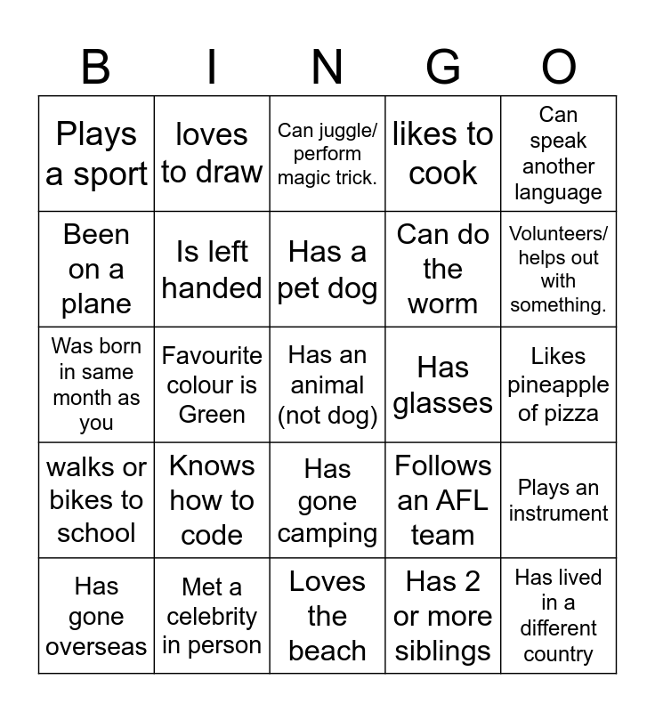 This bingo card has a free space and 24 words: Knows how to code, Met a celebrity in person, Has a pet dog, Has gone overseas, Can speak another language, Plays a sport, Been on a plane, loves to draw, Has glasses, Has gone camping, Can do the worm, Was born in same month as you, Follows an AFL team, Plays an instrument, Is left handed, Has 2 or more siblings, Likes pineapple of pizza, Can juggle/ perform magic trick., Volunteers/ helps out with something., Favourite colour is Green, Has lived in a different country, walks or bikes to school, likes to cook and Loves the beach.