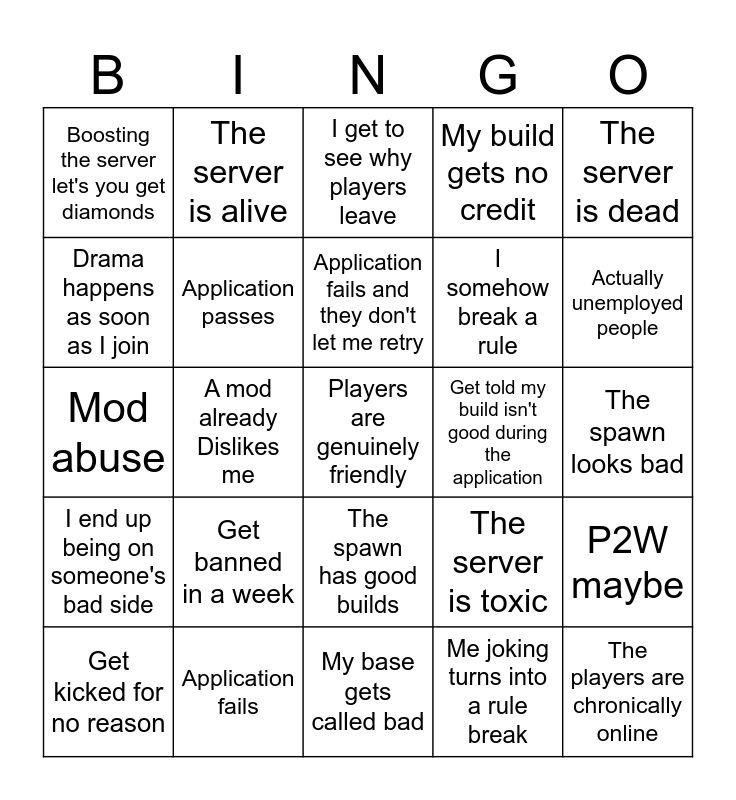 This bingo card has 25 words: Get banned in a week, My base gets called bad, Application fails and they don't let me retry, Get kicked for no reason, The server is dead, Boosting the server let's you get diamonds, Drama happens as soon as I join, The server is alive, Get told my build isn't good during the application, The spawn has good builds, I somehow break a rule, Mod abuse, The server is toxic, P2W maybe, Application passes, The players are chronically online, The spawn looks bad, I get to see why players leave, Actually unemployed people, A mod already Dislikes me, Players are genuinely friendly, Application fails, I end up being on someone's bad side, My build gets no credit and Me joking turns into a rule break.
