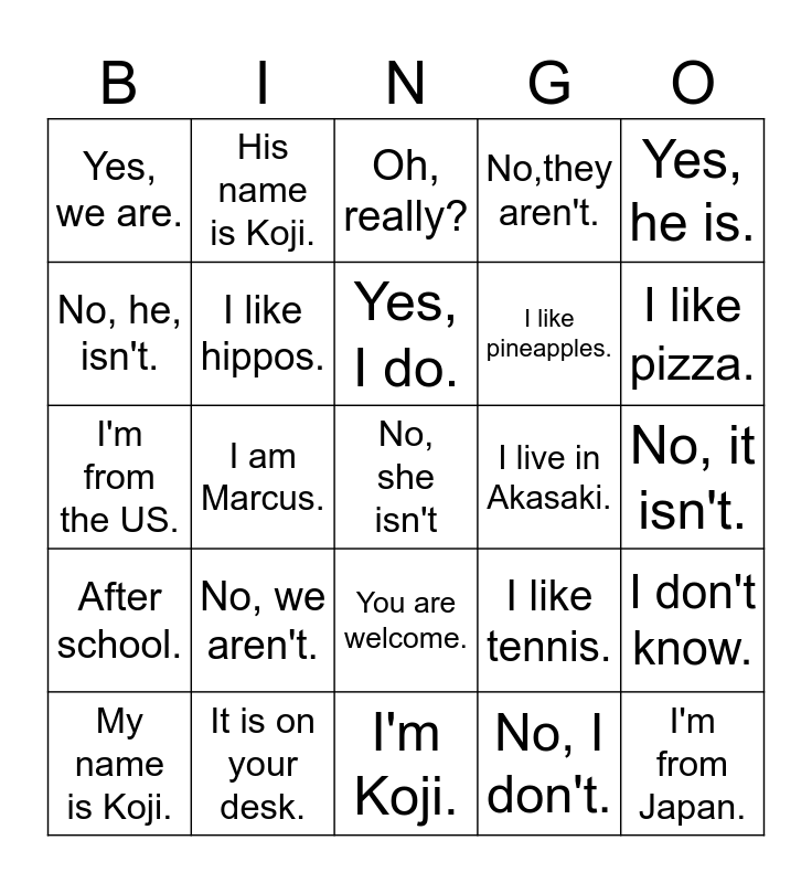 This bingo card has 35 words: Free!, Yes, I am., No, I'm not., Yes, I do., No, I don't., Yes, he is., No, he, isn't., Yes, she is., No, she isn't, Yes, it is., No, it isn't., Yes, we are., No, we aren't., Yes, they are., No,they aren't., I don't know., My name is Koji., His name is Koji., I'm Koji., I live in Akasaki., I'm from Japan., I'm from the US., I am Marcus., I like classical music., I like pineapples., I like pizza., No way., It is on your desk., You are welcome., I like tennis., I do kendo., After school., I like hippos., Oh, really? and Excuse me?.
