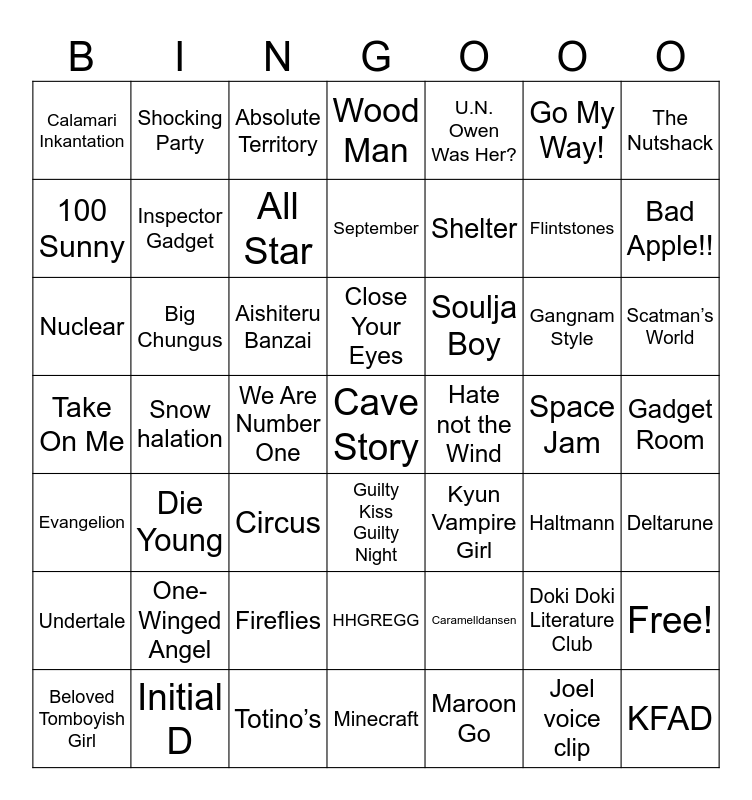 This bingo card has 50 words: Free!, Flintstones, Joel voice clip, Snow halation, Aishiteru Banzai, Guilty Kiss Guilty Night, Shocking Party, Minecraft, Go My Way!, Kyun Vampire Girl, The Nutshack, Wood Man, Gangnam Style, Soulja Boy, Fireflies, Gadget Room, 100 Sunny, Bad Apple!!, Beloved Tomboyish Girl, U.N. Owen Was Her?, Shelter, We Are Number One, Calamari Inkantation, Inspector Gadget, Initial D, Cave Story, All Star, Totino’s, Absolute Territory, Close Your Eyes, Voiceless, Evangelion, One-Winged Angel, HHGREGG, Take On Me, Space Jam, Haltmann, Deltarune, Undertale, Nuclear, Circus, Caramelldansen, Die Young, Maroon Go, Scatman’s World, September, Hate not the Wind, Doki Doki Literature Club, Big Chungus and KFAD.