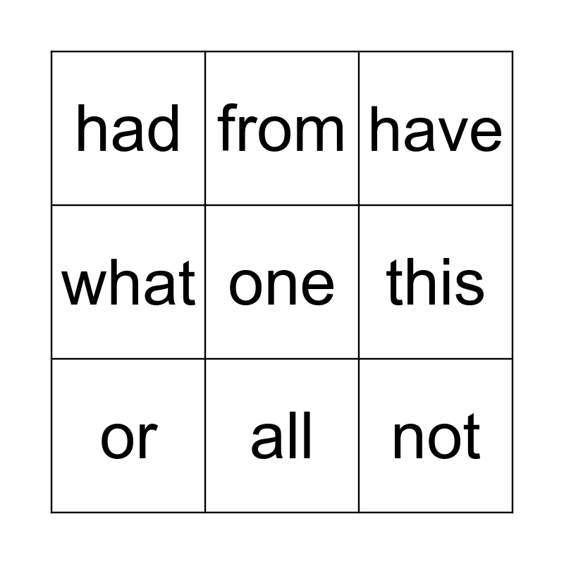 This bingo card has a free space and 8 words: this, have, from, or, had, not, what and all.
