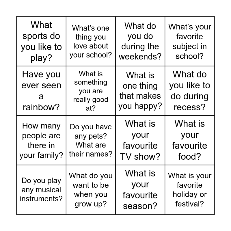 This bingo card has 16 words: What do you want to be when you grow up?, What is your favourite food?, What do you do during the weekends?, What sports do you like to play?, How many people are there in your family?, What’s one thing you love about your school?, What is your favourite TV show?, What is your favourite season?, Have you ever seen a rainbow?, What is something you are really good at?, Do you play any musical instruments?, What’s your favorite subject in school?, Do you have any pets? What are their names?, What do you like to do during recess?, What is one thing that makes you happy? and What is your favorite holiday or festival?.