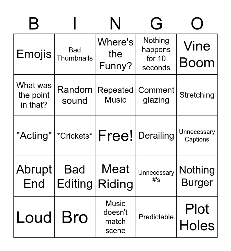 This bingo card has a free space and 24 words: Bad Editing, Bro, Repeated Music, Loud, Vine Boom, Emojis, What was the point in that?, Bad Thumbnails, Derailing, Meat Riding, Comment glazing, "Acting", Unnecessary #'s, Nothing Burger, Random sound, Predictable, Unnecessary Captions, Where's the Funny?, Stretching, *Crickets*, Plot Holes, Abrupt End, Nothing happens for 10 seconds and Music doesn't match scene.