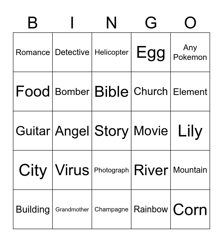 This bingo card has a free space and 24 words: Virus, Grandmother, Bible, Building, Any Pokemon, Romance, Food, Detective, Movie, Photograph, Church, Guitar, River, Mountain, Bomber, Rainbow, Lily, Helicopter, Element, Angel, Corn, City, Egg and Champagne.
