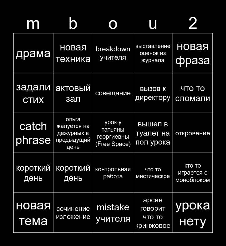 This bingo card has a free space and 61 words: пробник, сочинение изложение, у всех 2, короткий день, арсен говорит что то кринжовое, драка, актовый зал, плохое самочувствие, вызов к директору, гингангу, выставление оценок из журнала, отдых на физике, задали стих, сломался голос, кто то заболел, драма, урока нету, новая фраза, кто то опоздал, совещание, вышел в туалет на пол урока, breakdown учителя, новая тема, кто то играется с моноблоком, проверка дз, генеральнач уборка, почины, обновка, что то сломали, кого то спалили, докладная, посадили за первую парту, собирают телефоны, ивент вне школы, новая техника, уборка на улице, выгнали из класса, ольга жалуется на дежурных в предыдущий день, покупка через пушкинскую, catch phrase, тупая отговорка, короткий день, откровение, истерика (смех), что то мистическое, порвали тетрадку, смежный урок физры, новая фраза, щёлоч на уроке, контрольная работа, mistake учителя, рамдомный крик, звонок/вызов родителя, саунд эффекты, Roblox, кто то дразнит учителя, евгений актёр, противогаз, скример, съёмка and танцы/тренды тик тока.