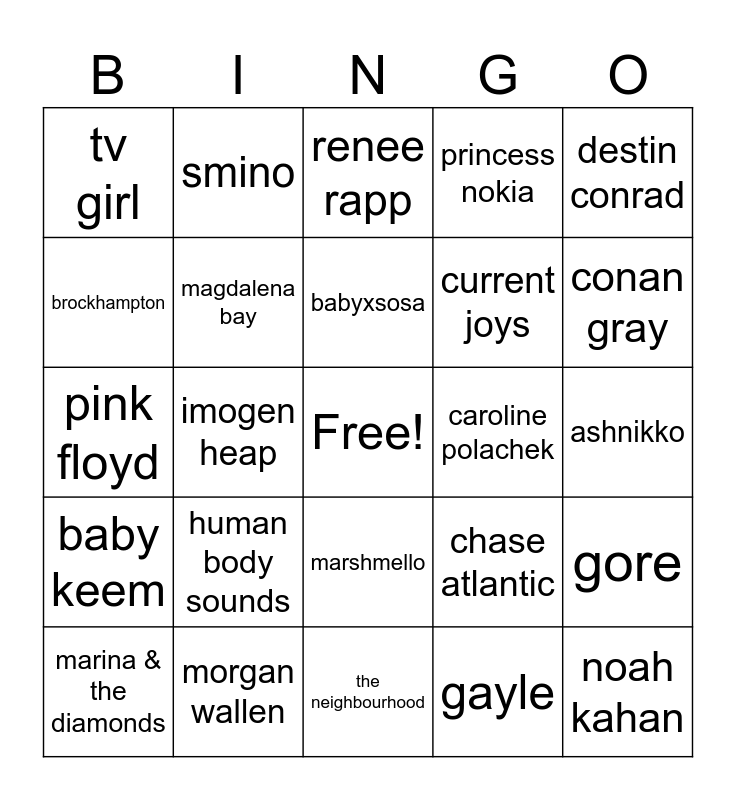 This bingo card has a free space and 24 words: human body sounds, morgan wallen, babyxsosa, marina & the diamonds, destin conrad, tv girl, brockhampton, smino, caroline polachek, marshmello, current joys, pink floyd, chase atlantic, gore, magdalena bay, gayle, ashnikko, renee rapp, conan gray, imogen heap, noah kahan, baby keem, princess nokia and the neighbourhood.