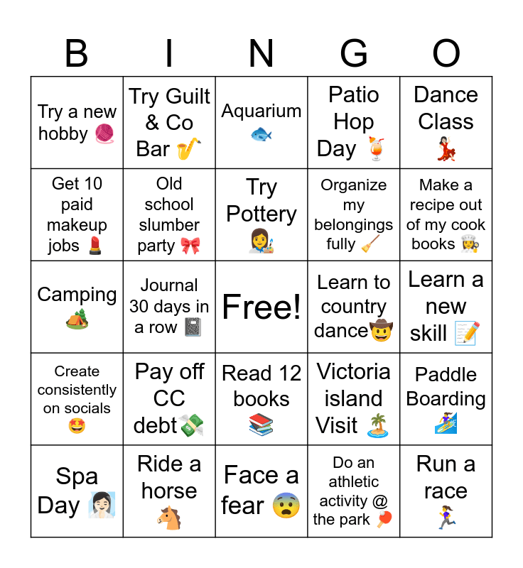 This bingo card has a free space and 24 words: Pay off CC debtπΈ, Ride a horse π΄, Try Pottery π©βπ¨, Spa Day π§π»ββοΈ, Dance Class ππ», Try a new hobby π§Ά, Get 10 paid makeup jobs π, Try Guilt & Co Bar π·, Learn to country danceπ€ , Read 12 booksπ, Organize my belongings fully π§Ή, Camping ποΈ, Victoria island Visit ποΈ, Paddle Boarding πββοΈ, Old school slumber party π, Do an athletic activity @ the park π, Learn a new skill π, Aquarium π, Make a recipe out of my cook books π©βπ³, Journal 30 days in a row π, Run a race πββοΈ, Create consistently on socials π€©, Patio Hop Day πΉ and Face a fear π¨.