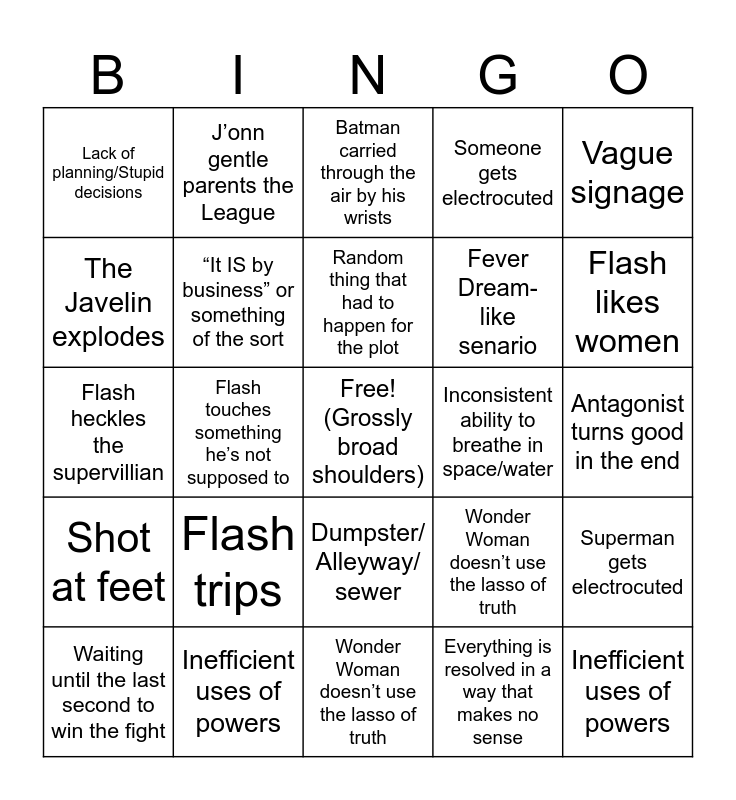 This bingo card has a free space and 53 words: Pillars collapsing, Inefficient uses of powers, Hawkgirl is the only one with a brain, Everything is resolved in a way that makes no sense, Flash trips, Flash likes women, J’onn gentle parents the League, Cryptic advice from Batman, The Javelin explodes, Animation change/animation error, “It IS by business” or something of the sort, Superman is somehow easily beat up, Superman gets electrocuted, Wonder Woman doesn’t use the lasso of truth, Batman carried through the air by his wrists, Waiting until the last second to win the fight, Random thing that had to happen for the plot, Inconsistent ability to breathe in space/water, Antagonist turns good in the end, Vague signage, Flash touches something he’s not supposed to, Dumpster/ Alleyway/ sewer, Fever Dream-like senario, Lack of planning/Stupid decisions, Pillars collapsing, Inefficient uses of powers, Hawkgirl is the only one with a brain, Everything is resolved in a way that makes no sense, Flash trips, Flash likes women, J’onn gentle parents the League, Cryptic advice from Batman, The Javelin explodes, Animation change/animation error, “It IS by business” or something of the sort, Superman is somehow easily beat up, Someone gets electrocuted, Wonder Woman doesn’t use the lasso of truth, Batman carried through the air by his wrists, Waiting until the last second to win the fight, Random thing that had to happen for the plot, Inconsistent ability to breathe in space/water, Antagonist turns good in the end, Vague signage, Flash touches something he’s not supposed to, Dumpster/ Alleyway/ sewer, Fever Dream-like senario, Lack of planning/Stupid decisions, Flash heckles the supervillian, Shot at feet, Someone presumed dead, Villain isn’t really defeated and Unnecessary electricity.