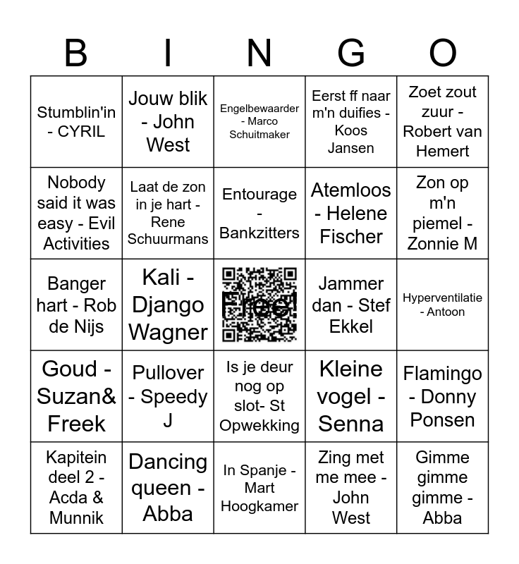 This bingo card has a free space and 52 words: Amalia - Wesley Bronkhorst, Gimme gimme gimme - Abba, Alles kwijt - Tino Martin, In Spanje - Mart Hoogkamer, Pullover - Speedy J, Sapperdiosia - Trane met tuite, Jouw blik - John West, Hartslag van de Stad- Tino & Mart, Nobody said it was easy - Evil Activities, Blikkendag - Sven Versteeg, Laat de zon in je hart - Rene Schuurmans, Terug in de tijd - Yves Berendse, Flamingo - Donny Ponsen, Kleine vogel - Senna, Viva serveza - Ferry de Lits, Sugardaddy - Roxy Dekker, Entourage - Bankzitters, Jammer dan - Stef Ekkel, Echte liefde - Martin Morero, Zoet zout zuur - Robert van Hemert, Kali - Django Wagner, Zing met me mee - John West, Stumblin'in - CYRIL, Atemloos - Helene Fischer, Bella Ciao - Pater Moeskroen, Sweet Caroline - Dimitri Vegas, Sara Perche ti amo - DJ Redblack, Jij krijgt die lach niet - John de Bever, Zon op m'n piemel - Zonnie M, FC lied - FC 's-Gravenzande, Mijn kroeg - DJ Henkie, Eerst ff naar m'n duifies - Koos Jansen, Wonderful days - Charly Lownoise& Mental Theo, What's up - Basston, We are the champions - Queen, Engelbewaarder - Marco Schuitmaker, Dancing queen - Abba, luv you more - DJ Paul Elstak, Ratata - la Fuente, Zeg maar niets meer - Bass Chaserz, Witte was - Goldband, Hyperventilatie - Antoon, Goud - Suzan& Freek, Blijf je vanavond - Monique Smit, Is je deur nog op slot- St Opwekking, Rebel baby - Outsiders, Hey baby - cooldown cafe, Banger hart - Rob de Nijs, Veeg ze van het matje - Chicco, De Toreador - Wilbert Pigmans, Kapitein deel 2 - Acda & Munnik and Mbappe - Lirical.