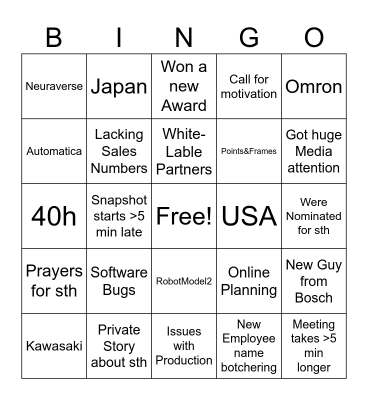 This bingo card has a free space and 25 words: Software Bugs, Issues with Production, White-Lable Partners, Kawasaki, Omron, Neuraverse, Automatica, Japan, USA, RobotModel2, Points&Frames, 40h, Online Planning, New Guy from Bosch, Lacking Sales Numbers, New Investors coming, Were Nominated for sth, Won a new Award, Got huge Media attention, Snapshot starts >5 min late, Meeting takes >5 min longer, Private Story about sth, Prayers for sth, Call for motivation and New Employee name botchering.