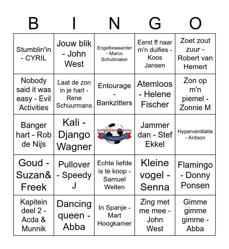 This bingo card has a free space and 52 words: Amalia - Wesley Bronkhorst, Gimme gimme gimme - Abba, Alles kwijt - Tino Martin, In Spanje - Mart Hoogkamer, Pullover - Speedy J, Sapperdiosia - Trane met tuite, Jouw blik - John West, Hartslag van de Stad- Tino & Mart, Nobody said it was easy - Evil Activities, Blikkendag - Sven Versteeg, Laat de zon in je hart - Rene Schuurmans, Terug in de tijd - Yves Berendse, Flamingo - Donny Ponsen, Kleine vogel - Senna, Viva serveza - Ferry de Lits, Sugardaddy - Roxy Dekker, Entourage - Bankzitters, Jammer dan - Stef Ekkel, Echte liefde - Martin Morero, Zoet zout zuur - Robert van Hemert, Kali - Django Wagner, Zing met me mee - John West, Stumblin'in - CYRIL, Atemloos - Helene Fischer, Bella Ciao - Pater Moeskroen, Sweet Caroline - Dimitri Vegas, Sara Perche ti amo - DJ Redblack, Jij krijgt die lach niet - John de Bever, Zon op m'n piemel - Zonnie M, FC lied - FC 's-Gravenzande, Mijn kroeg - DJ Henkie, Eerst ff naar m'n duifies - Koos Jansen, Wonderful days - Charly Lownoise& Mental Theo, What's up - Basston, 100% - Flemming& Mart Hoogkamer, Engelbewaarder - Marco Schuitmaker, Dancing queen - Abba, luv you more - DJ Paul Elstak, Ratata - la Fuente, Zeg maar niets meer - Bass Chaserz, Zaazaa - Frenna, Hyperventilatie - Antoon, Goud - Suzan& Freek, Blijf je vanavond - Monique Smit, Echte liefde is te koop -Samuel Welten, Baila de Gasolina - effe Serieus, Mona Lisa - Robert van Hemert, Banger hart - Rob de Nijs, Veeg ze van het matje - Chicco, De Toreador - Wilbert Pigmans, Kapitein deel 2 - Acda & Munnik and lotje - Lustrum U.V.S.V.