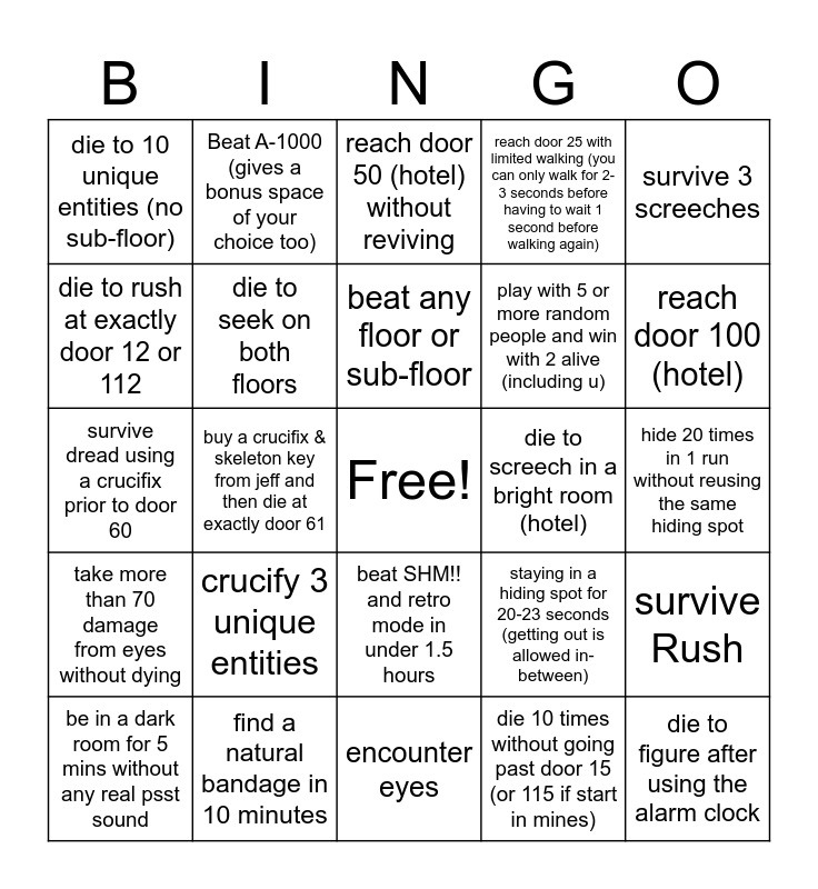 This bingo card has a free space and 24 words: crucify 3 unique entities, find a natural bandage in 10 minutes, beat any floor or sub-floor, be in a dark room for 5 mins without any real psst sound, survive 3 screeches, die to 10 unique entities (no sub-floor), die to rush at exactly door 12 or 112, Beat A-1000 (gives a bonus space of your choice too), die to screech in a bright room (hotel), beat SHM!! and retro mode in under 1.5 hours, play with 5 or more random people and win with 2 alive (including u), survive dread using a crucifix prior to door 60, staying in a hiding spot for 20-23 seconds (getting out is allowed in-between), survive Rush, die to seek on both floors, die 10 times without going past door 15 (or 115 if start in mines), hide 20 times in 1 run without reusing the same hiding spot, reach door 50 (hotel) without reviving, reach door 100 (hotel), buy a crucifix & skeleton key from jeff and then die at exactly door 61, die to figure after using the alarm clock, take more than 70 damage from eyes without dying, reach door 25 with limited walking (you can only walk for 2-3 seconds before having to wait 1 second before walking again) and encounter eyes.