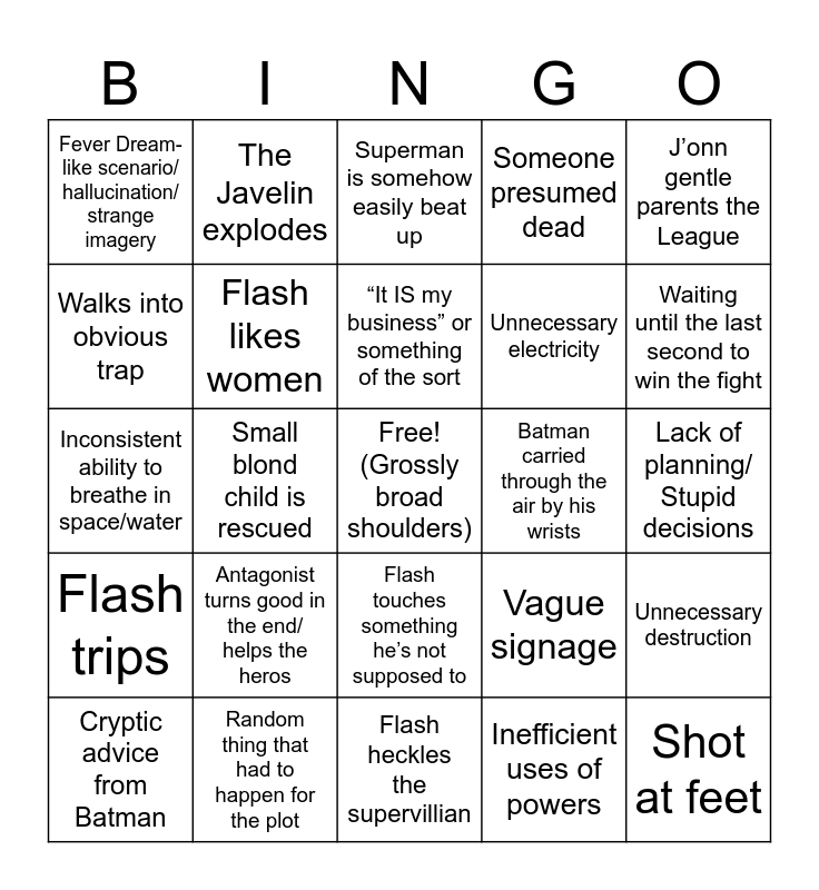 This bingo card has a free space and 34 words: Pillars collapsing, Inefficient uses of powers, Hawkgirl is the only one with a brain, Everything is resolved in a way that makes no sense, Flash trips, Flash likes women, J’onn gentle parents the League, Cryptic advice from Batman, The Javelin explodes, Animation change/ animation error, “It IS my business” or something of the sort, Superman is somehow easily beat up, Someone gets electrocuted, Wonder Woman doesn’t use the lasso of truth, Batman carried through the air by his wrists, Waiting until the last second to win the fight, Random thing that had to happen for the plot, Inconsistent ability to breathe in space/water, Antagonist turns good in the end/ helps the heros, Vague signage, Flash touches something he’s not supposed to, Dumpster/ Alleyway/ Sewer/ Subway, Fever Dream-like scenario/ hallucination/ strange imagery, Lack of planning/ Stupid decisions, Flash heckles the supervillian, Shot at feet, Someone presumed dead, Villain isn’t really defeated, Unnecessary electricity, Walks into obvious trap, Green Lantern’s ring has tracking powers, Small blond child is rescued, Unnecessary destruction and Epilepsy warning needed.