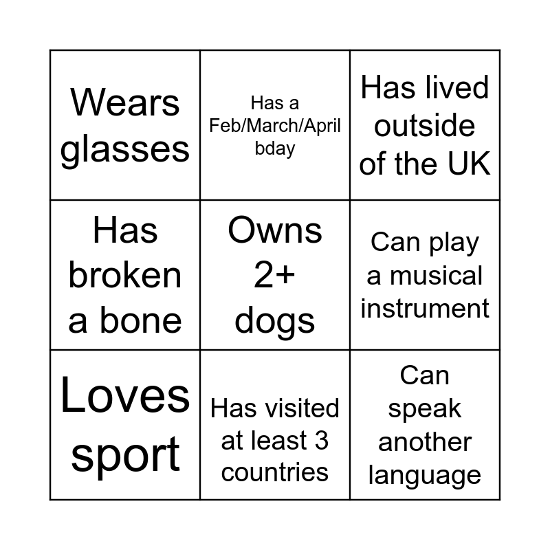 This bingo card has 15 words: Has brown hair, Is wearing blue, Has lived outside of the UK, Wears glasses, Has visited at least 3 countries, Owns 2+ dogs, Is left handed, Has a younger sibling, Can play a musical instrument, Can speak another language, Has blue eyes, Has broken a bone, Loves sport, Has a Feb/March/April bday and Likes pineapple on pizza.